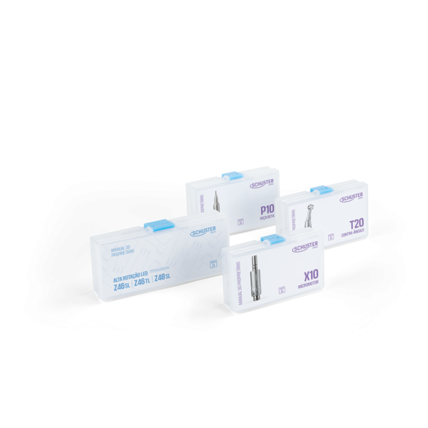 O Kit Acadêmico S4 Push LED da Schuster, possui a Alta Rotação Z48SL com Ring Led e Titânio, Micro Motor X10 e Contra Ângulo T20 e Peça Reta X10.